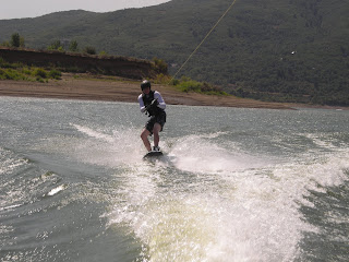 We were invited to go with some very nice friends and family to the lake this weekend. We brought along our friend the retarded boy. We had to suit him up in a helmet just in case he bounced his head off of the water. Here are some pictures of him. He nearly drowned.
